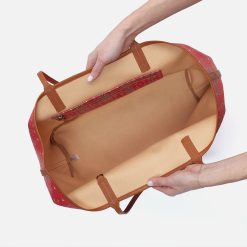 She’s all that and a bag of chips! This carry-all tote is for when your hands are full. but your life is fuller. Lap top? Slip it in. Your wallet? Add that too. A bag of literal chips? This tote can carry it all – and then some! Now in a larger size to carry even more – and red and blue printed bandana leather – this is the bag of your Americana dreams.