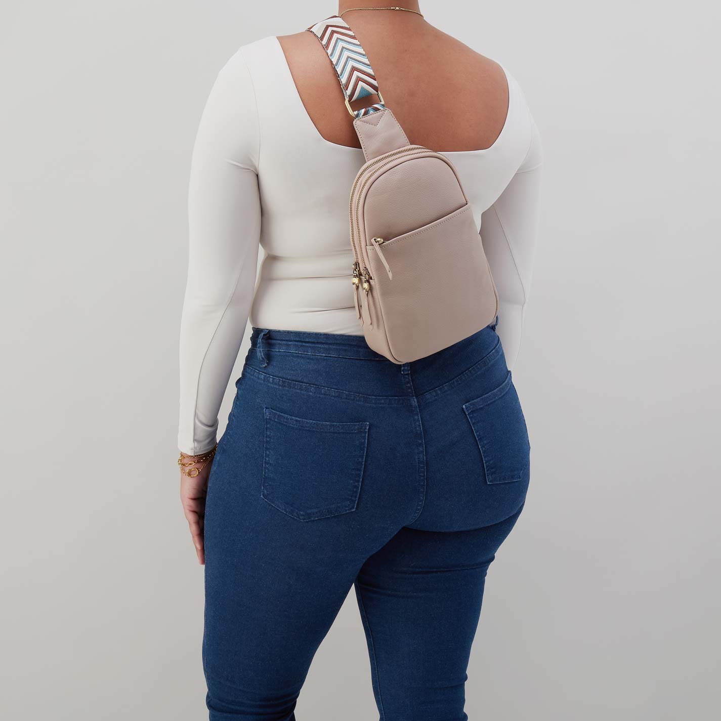 When you have your hands full. Cass Sling’s the hands-free hero right there to help. Plenty of interior space. a new chevron webbing strap. and adjustablity – more than a bag. Cass is your sidekick in style
